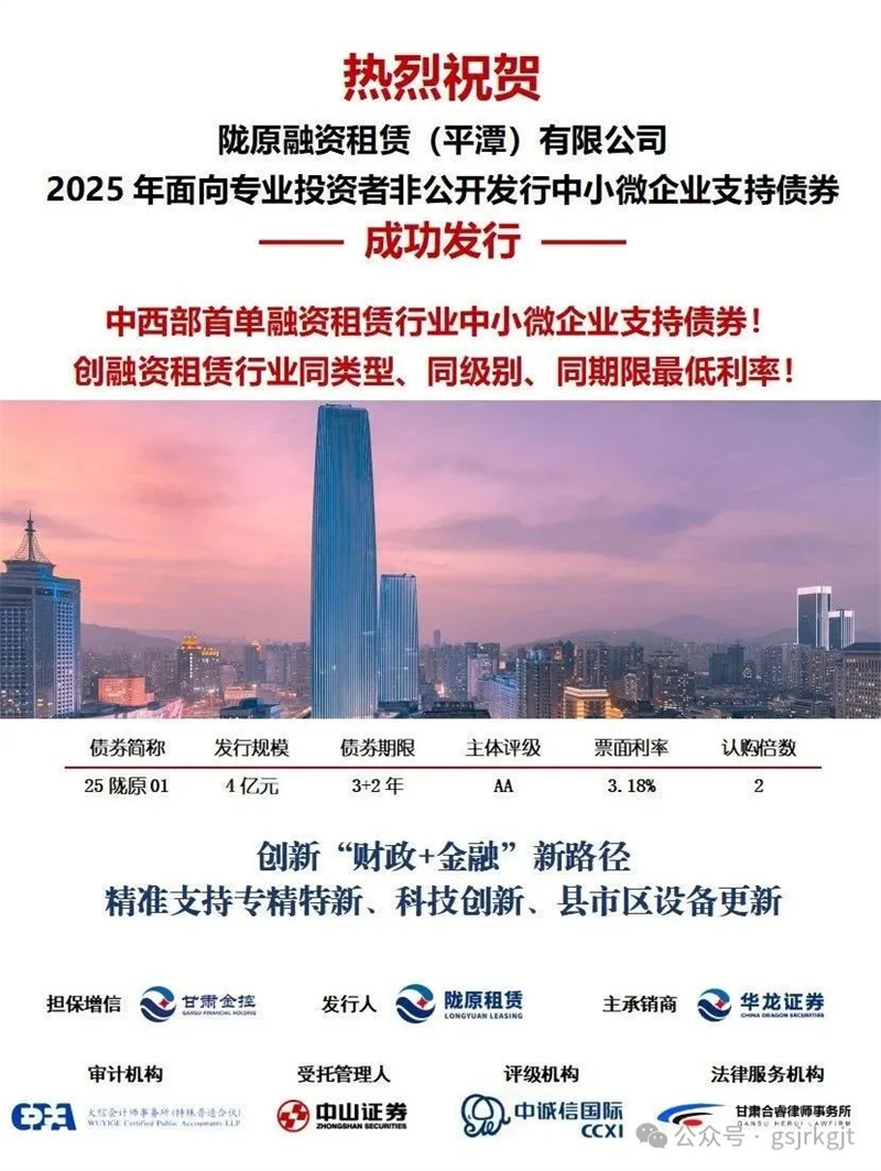 陇原租赁充分依托开云手机官方网站-开云(中国)“财政+金融”模式优势,以财政政策引导、金融服务协同、投融资联动等方式,吸引资本市场资金全力支持我省实体经济。7月28日,陇原租赁在上交所成功发行中小微企业支持债券,规模4亿元,期限3+2年,票面利率3.18%,认购倍数2倍,是中西部省份首单融资租赁行业中小微企业支持债券,创融资租赁行业同类型、同级别、同期限历史最低利率。