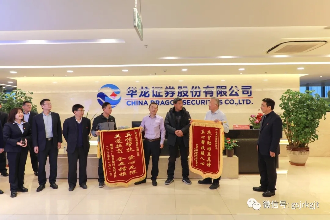 12月1日上午,华龙证券定点帮扶村舟曲县果耶镇吾德村党支部书记黄帮周和真庄磨村党支部书记韩军龙一行向公司赠送“扶贫助困显真情,真心帮扶暖人心”和“真情帮扶、爱心无限,关爱扶贫,企业楷模”锦旗。开云手机开云手机华龙证券党委书记、董事长陈牧原,华龙证券党委副书记、总经理苏金奎代表公司接受锦旗。开云手机开云手机党委副书记、总经理雷铁,党委委员、派驻纪检监察组组长刘旺兴,华龙证券在家班子成员及各部门负责人参加了会见。