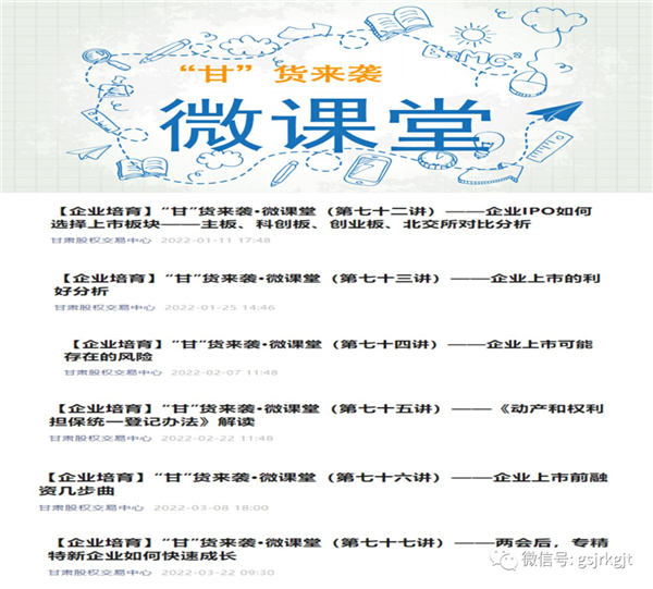 为保证培育任务不停摆、不断档,甘肃股权交易中心持续推进培训工作,开辟线上培训、讲座新路径。第一季度已累计举办线上培训讲座18场,培育667人次。一方面通过“甘”货来袭·微课堂开展上市融资、专精特新政策导向等方面解读,精准解答中小企业发展中遇到的困惑;另一方面利用科融通云讲堂系列培训课程及心流慧估“专精特新”企业服务系列培训课程,深入剖析新阶段行业趋势和机遇,助力企业长期高速发展。